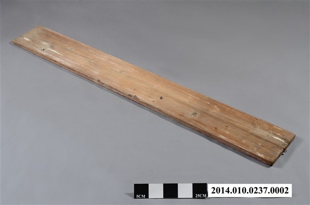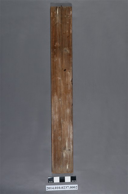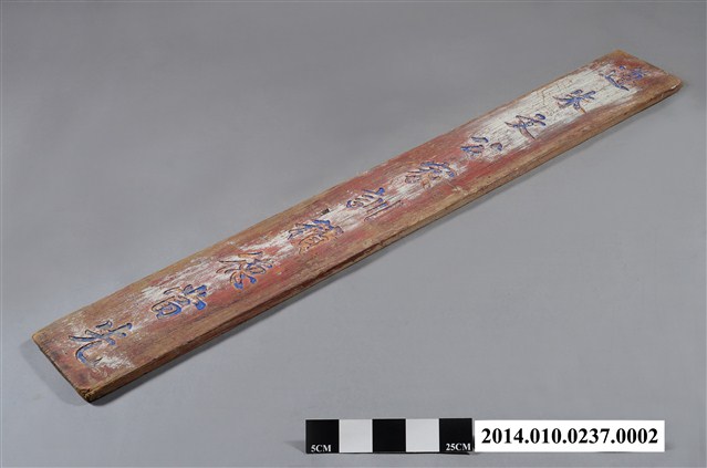 本件為台南神農街私宅對聯,上聯文字為:「守東平王格言為善最樂」;下聯為:「遵朱文公家訓積德當先」。東平王為東漢劉蒼,朱文公為明代朱熹。此一對聯常見的下聯為:「遵司馬公家訓積德當先」,推測應為受儒家文化浸染甚深的自家對聯。據收藏家洪輝龍所述,此為道光年間物件。