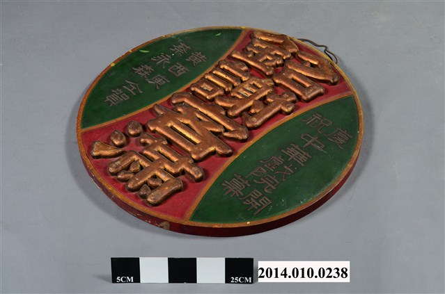 本件為慶祝中華戲院開張的祝賀圓匾,上寫有祝賀人的姓名,以及「銘謝客滿」字樣 ,反映電影產業歷史。