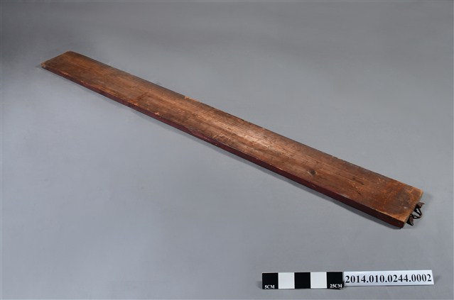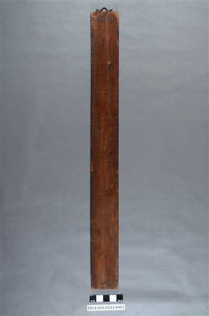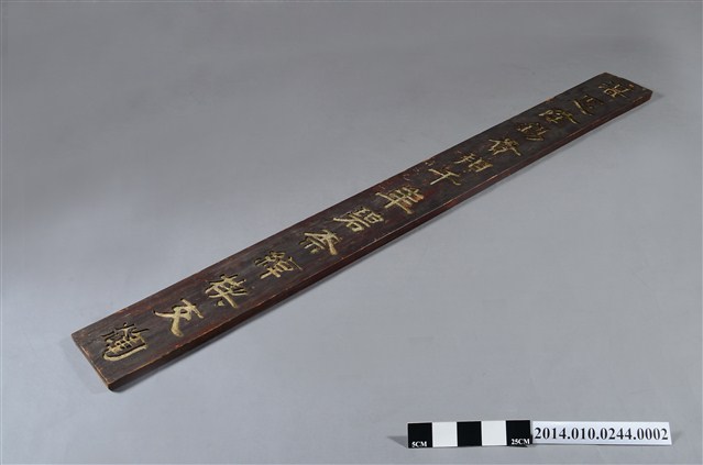 此為清代道光年間台灣書法家莊俊元的木雕書法作品。書法一聯的內容為:「堪思隆錫賚?千年碧奈綽楔交輝」。