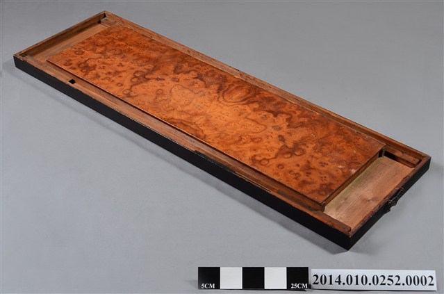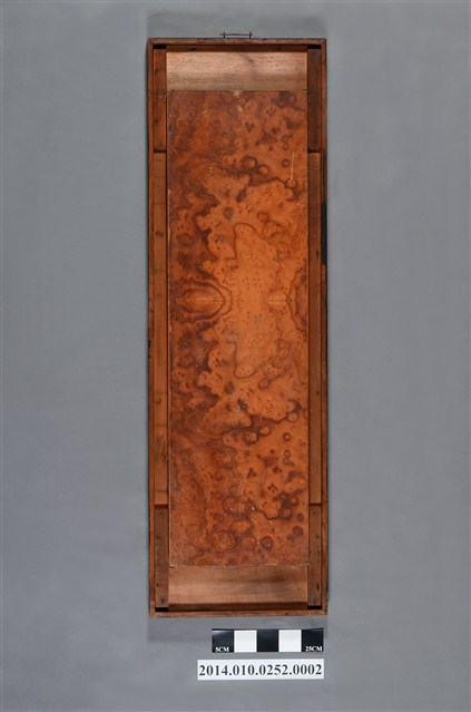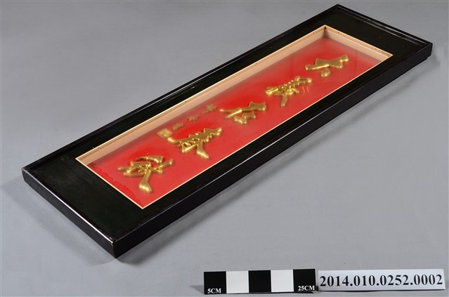 此為木雕的關公對聯及圖像組。對聯為表彰關公的字句,圖像則為關公讀春秋及其義子隨伺在旁的圖像。對聯為歐陽錦華的書法字,其為著名的鹿港書法家;木雕則出自李松林之手。李松林為臺灣重要的木雕藝師,其作品散見臺灣各地廟宇,1985年榮獲教育部首屆薪傳獎,1989年再獲教育部評定為臺灣重要民族藝師。此物件為對聯的下聯:「大義在春秋」。