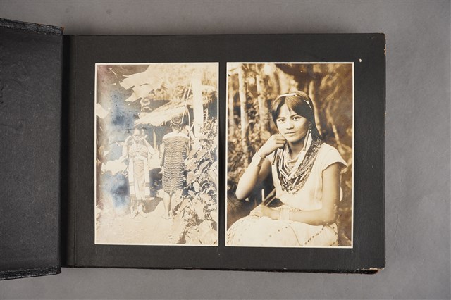 此文件為大正12年(1923)上原勇作元帥臺灣藩地巡視演說過程中所拍攝之黑白相片,相片內容為兩位泰雅族人,男女穿著傳統服飾珠衣,左方女子吹奏口簧琴,右方男子則背對鏡頭,右下方可見芋頭葉叢,相片品質良好。上原勇作,橫跨明治至昭和時期大日本帝國陸軍中的重要人物,明治15年(1885)至歐洲見學歸國後,在日本工程兵近代化上帶來不少貢獻,人稱日本工程兵之父。在陸軍內長州藩軍閥沒落後,上原勇作為主的上原軍閥則漸漸取得強勢,陸續擔任過日本陸軍內三大職位,包括教育総監、陸軍大臣、參謀総長,並於大正10年(1921)受封爵位與元帥。而後於大正12年(1923)裕仁皇太子臺灣行啟期間,至今桃園復興鄉角板山附近視察當地泰雅蕃殖民情況,並進行演說,期間隨行攝影師紀錄下不少寫真,包括蕃人像、駐在所、吊橋等內容。