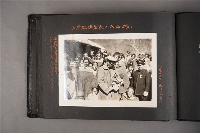此文件為大正12年(1923)1月4日上原勇作元帥臺灣藩地巡視演說過程中所拍攝之黑白相片,相片內容為陸軍參謀總長上原勇作,在攝政宮殿下來台行啟前,入山地探視蕃地殖民狀況,並與新竹州知事梅谷光禎一同前往。拍攝地點為大溪郡內停車場。上原勇作,橫跨明治至昭和時期大日本帝國陸軍中的重要人物,明治15年(1885)至歐洲見學歸國後,在日本工程兵近代化上帶來不少貢獻,人稱日本工程兵之父。在陸軍內長州藩軍閥沒落後,上原勇作為主的上原軍閥則漸漸取得強勢,陸續擔任過日本陸軍內三大職位,包括教育総監、陸軍大臣、參謀総長,並於大正10年(1921)受封爵位與元帥。而後於大正12年(1923)裕仁皇太子臺灣行啟期間,至今桃園復興鄉角板山附近視察當地泰雅蕃殖民情況,並進行演說,期間隨行攝影師紀錄下不少寫真,包括蕃人像、駐在所、吊橋等內容。