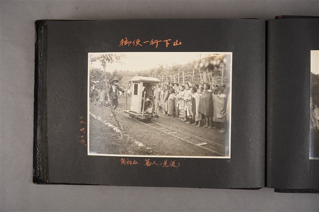 此文件為大正12年(1923)4月26日裕仁皇太子東宮行啟期間所拍攝之黑白相片,相片內容為東宮侍從(日本甘露寺變長伯爵)入角板山視察且宣傳皇太子旨意後,蕃人列隊送行之景,交通方式與上山一樣,使者們搭乘特製雙軌車,利用人力方式推送下山,相片品質良好。上原勇作,橫跨明治至昭和時期大日本帝國陸軍中的重要人物,明治15年(1885)至歐洲見學歸國後,在日本工程兵近代化上帶來不少貢獻,人稱日本工程兵之父。在陸軍內長州藩軍閥沒落後,上原勇作為主的上原軍閥則漸漸取得強勢,陸續擔任過日本陸軍內三大職位,包括教育総監、陸軍大臣、參謀総長,並於大正10年(1921)受封爵位與元帥。而後於大正12年(1923)裕仁皇太子臺灣行啟期間,至今桃園復興鄉角板山附近視察當地泰雅蕃殖民情況,並進行演說,期間隨行攝影師紀錄下不少寫真,包括蕃人像、駐在所、吊橋等內容。