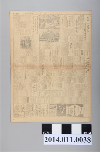 2.《臺灣日報》,前身為日本時代在臺南創立之《臺南新報》,《臺南新報》1899年由富地近思創辦,與《臺灣日日新報》、《臺灣新聞》並稱為日治時期臺灣三大官報,與《臺灣日日新報》相比《臺南新報》屬於地方報紙,其報導內容雖仍有世界、日本及臺灣各地消息,但比較他報相比專注於南部消息,且內容較為活潑,對於南部的經濟、米、糖報導較為精確,1937年4月中日戰事將起,日本當局下令所有報刊停止漢文欄,《臺南新報》更名為《臺灣日報》。1944年3月又與《臺灣日日新報》、《臺灣新聞》、《興南新聞》、《東臺灣新報》、《高雄新報》6家日報同遭廢刊,而後齊併為《臺灣新報》刊行。由報導內容看來,戰爭消息已成為主要篇幅,且可能受戰事影響,物資缺乏,刊載篇幅已從8面縮減至1面。昭和18年(1943)12月20日。