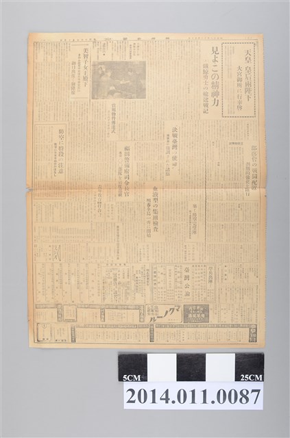 1.本文件為昭和18年(1943)12月30日興南新聞臺灣本社發行之《興南新聞第4655號》第一頁,當時正值太平洋戰爭時期,報紙內容提及日本在第六、第九站區將敵軍主力擊滅所取的的戰果,以及日軍迎擊ラペウル的來襲,所取得的戰果。另外,本期探討的主題尚有:日軍徹底粉碎第六戰區、樞府定例本會議、帝國的一大政治攻勢:戰時外交的回顧與展望,此外還有一篇社論:掉尾的悲鳴。大致上來看,本期報導的內容主要是在談論日本在第六、第九戰區取得的成果以及突破,以及國內對戰爭持續到當時的一些看法。