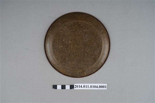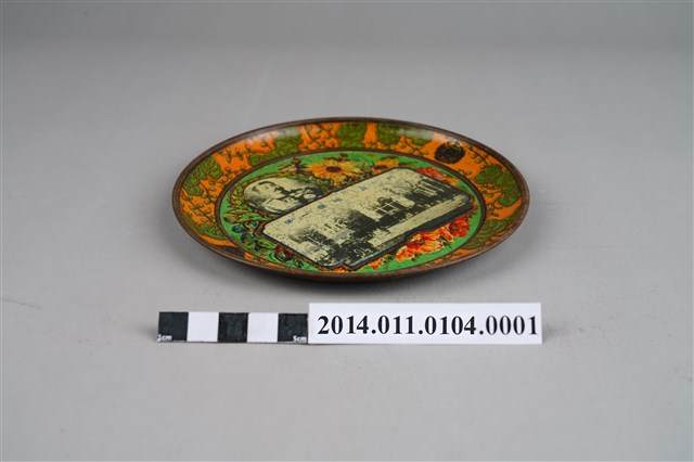 1.本文物為始政四十周年紀念臺灣博覽會所推出的紀念鐵盤,以黃色作為底色,盤子外圍有鳳凰裝飾,內有牡丹、水仙等花鳥圖裝飾,中心為當時臺灣博覽會第一會場的朝鮮館相片圖。鐵盤保存尚完整,只是表面有部分灰色斑點。
