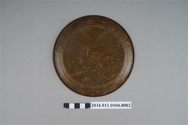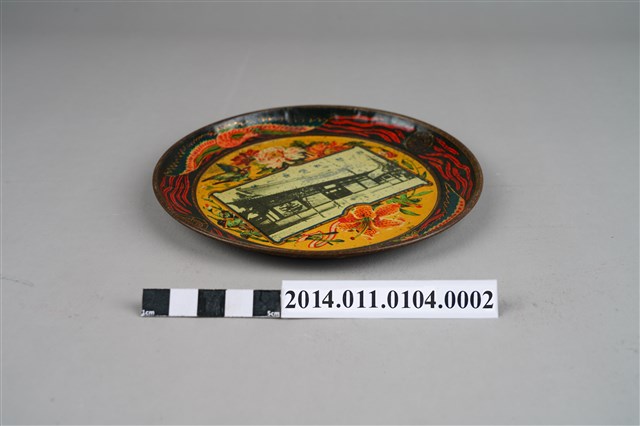 1.本文物為始政四十周年紀念臺灣博覽會所推出的紀念鐵盤,以黃色作為底色,盤子外圍有鳳凰裝飾,內有牡丹、水仙等花鳥圖裝飾,中心為當時臺灣博覽會第一會場的「朝鮮館」相片圖。鐵盤保存尚完整,只是表面有部分灰色斑點。