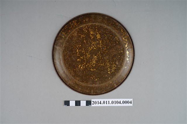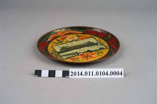 1.本文物為始政四十周年紀念臺灣博覽會所推出的紀念鐵盤,以黃色作為底色,盤子外圍有鳳凰裝飾,內有牡丹、水仙等花鳥圖裝飾,中心為當時臺灣博覽會第二會場的「臺灣館」相片圖。鐵盤保存尚完整,只是表面有部分灰色斑點。