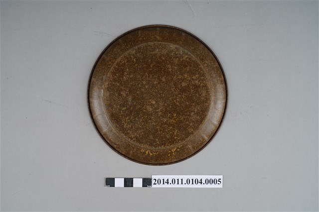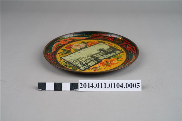 1.本文物為始政四十周年紀念臺灣博覽會所推出的紀念鐵盤,以黃色作為底色,盤子外圍有鳳凰裝飾,內有牡丹、水仙等花鳥圖裝飾,中心為當時臺灣博覽會第一會場的「美術館」相片圖。鐵盤保存尚完整,只是表面有部分灰色斑點。