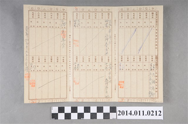 1. 本文物為三三○二八番號保險金領收帳,有付款日期、證書作成日、付款方法、被保險者氏名、契約者氏名等幾個欄位,其中契約者氏名為張永華,證書作成日為12日,保科金額為1.00,內寫有保險相關法規、保險公司規則等注意事項,並蓋有相關單位的戳章,但付款合併表格登記之處為空白,背面表格有詳細記錄保險所屬月份、受領月日、受領者記名等資訊,並於表末用鉛筆標示此份保險從民國38年4月至民國83年9月分受領。
