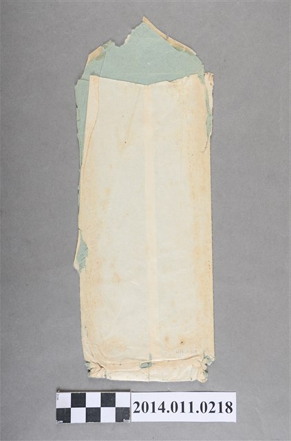 1. 本文物為買徽接老契之信封,此信封為白色,內有綠色底色,其功用應為裝置契書等文書,並在上面以書法字體寫有買徽接老契,信封上有泛黃水漬,可看出其年代已久。