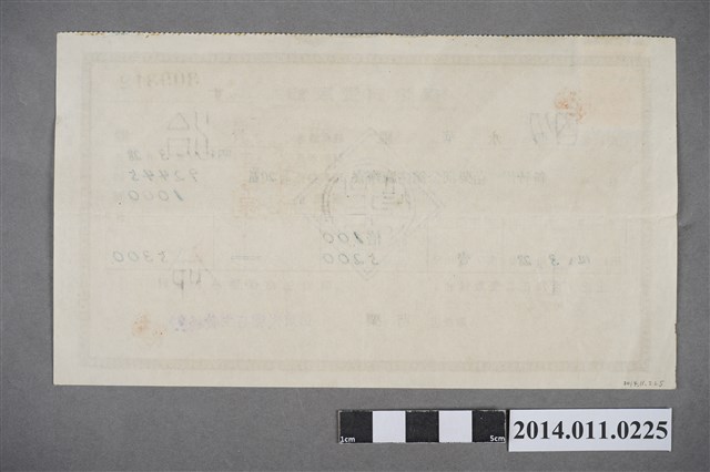 1. 本文物為保險金受取證,契約年月為昭和11年(1936)3月28日,付款日期為昭和14年(1939)3月28日,總共一年份,保險金為一倍,目前繳納五十二元,差引付款額為五三元,契約者是苗栗郡公館庄蔴齊寮九三番地之張永華,被保險者為貴,證券番號為付利20有限 92.445號,保金全額1000圓,並於證書右邊寫有相關注意事項,而此保險的經營者為明治生命保險株式會社苗栗代理店種黃逢良。文件右上角貼有日南政府印紙收入三錢的印花稅票一張,並蓋有相關戳記。