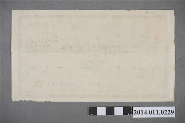 1. 本文物為保險金受取證,契約年月為昭和11年(1936)3月28日,付款日期為昭和13年(1938)11月28日,總共一年份,保險金為倍一,目前繳納五二元,差引付款額為五三元,契約者是苗栗郡公館庄蔴齊寮九三番地之張永華,被保險者為貴,證券番號為付利20有限 92.441號,保金全額1000圓,並於證書右邊寫有相關注意事項,而此保險的經營者為明治生命保險株式會社苗栗代理店主黃逢良。文件右上角貼有日南政府印紙收入三錢的印花稅票一張,並蓋有相關戳記。