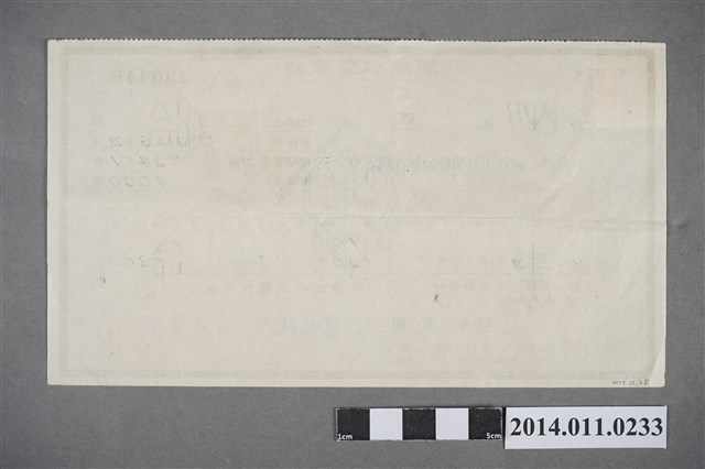 1. 本文物為保險金受取證,契約年月為昭和11年(1936)3月28日,付款日期為昭和15年(1940)3月28日,總共一年份,保險金為倍一,目前繳納五十二元,利益分配金為○圓,差引付款額為五十三元,契約者是苗栗郡公館庄蔴齊寮九三番地之張永華,被保險者為貴,證券番號為付利20有限 92.441號,保金全額1000圓,並於證書右邊寫有相關注意事項,而此保險的經營者為明治生命保險株式會社苗栗代理店主黃逢良。文件右上角貼有日南政府印紙收入三錢的印花稅票一張,並蓋有相關戳記;而左下角則有一虛線方框內寫有十元以上收入印紙。