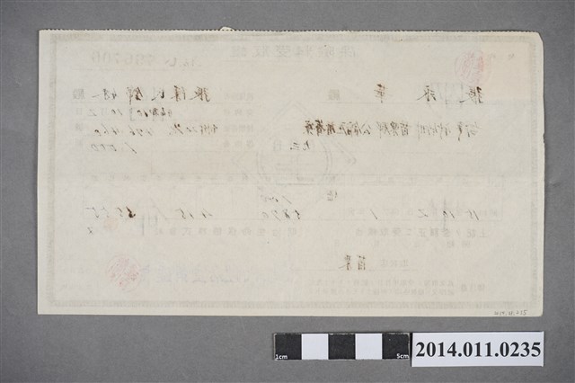 1. 本文物為保險金受取證,契約年月為昭和10年(1935)10月2日,付款日期為昭和15年(1940)10月2日,總共一年份,保險金為倍一,目前繳納五八‧七圓,利益分配金為四‧一五圓,差引付款額為五五‧五五圓,契約者是苗栗郡公館庄蔴齊寮九1三番地之張永華,被保險者為張陳氏錦妹,證券番號為付利20營 476,460號,保金全額1000圓,並於證書右邊寫有相關注意事項,而此保險的經營者為明治生命保險株式會社苗栗代理店主黃逢良。文件左下角貼有日南政府印紙收入三錢的印花稅票一張,並蓋有相關戳記。