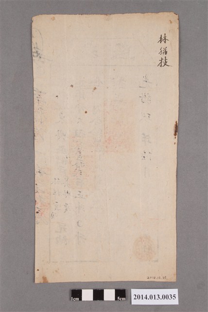為業主劉清苑給東興庄佃戶林祥雲(頂吳興漢)腳大該年大租穀壹拾貳時的執照(證明)。另有「東興庄業戶劉清苑信記」印、二方印章與二枚騎縫章。