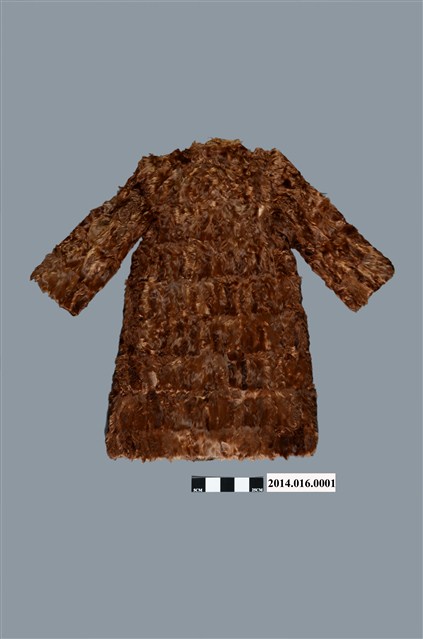 1. 深褐色毛皮大衣,面料以小型哺乳動物(推測為貂或鼠) 之毛皮拼縫而成,動物毛以人工染色為深褐色,大衣內裡採淺褐色絲綢布。大衣身長115公分,肩袖寬112公分,立領,肩寬50公分,內層附有墊肩(但僅剩左墊肩,右墊肩已遺失),袖長58公分,袖口寬大。右襟胸部側邊內裡附有一夾層暗袋開口,內裡右腋下處附有兩條綁帶,左襟內裡縫有一小型口袋,口袋口以2只蝴蝶結裝飾。軀幹剪裁呈A字型,穿著時長度約及膝,下襬寬大,底邊面料與內裡未縫合,方便穿著時多層布料自然垂墜平整。