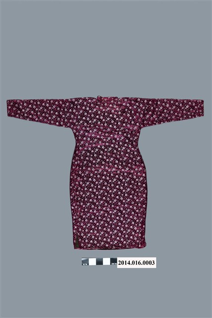 2. 根據任崇潔小姐描述,本件旗袍為母親從大陸帶來臺灣的秋冬衣物,購買時間與地點不詳。任小姐今年66歲,1歲時(1949年)隨父母親來臺,由於旗袍內外無任何製作或販賣店家商標,僅能從旗袍的剪裁與款式推斷,推測本件旗袍約為1930-1940年代。