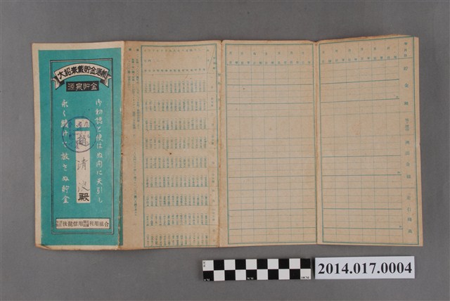 地址登載為頭湖85番地。本物件為戰爭期間1943年~1945年期間後龍、公司寮、水尾子、二張犁、大山腳、頭湖、崎頂等地人民之銷帳儲金簿,內頁印有大詔奉戴字樣,並以婚葬儀式簡化、宴會遠慮、新謁見合せ、虛禮廢止、節酒節煙、徒步勵行、副業勉強倡導儲金,另外印有儲簿規定如:不許轉讓、改印需申請等,背頁附有複利合計表。大詔指的是1941年對美、英兩國之宣戰詔書,1942年起每個月8日定為大詔奉戴日,為日本政府為太平洋戰爭所運作的國民運動,隨著戰爭規模擴大,戰時有各項國民強迫儲蓄的舉措,以支援前線戰事,1938年日本政府為因應中日戰爭即推行有愛國儲蓄運動,本物件則為1942年後因應戰爭規模擴大後之儲蓄項目,范雅鈞指出本儲金簿為強制存款,直接由薪資扣除。