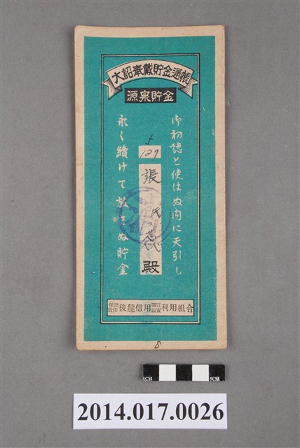 2014.017.0026 保證責任後龍信用購買販賣利用組合給張蕊大詔奉戴儲金簿