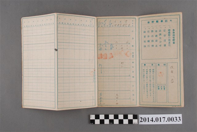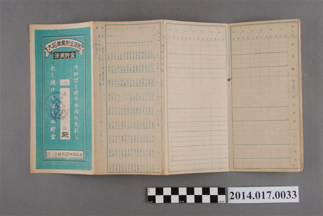 地址載有後龍1、54。本物件為戰爭期間1943年~1945年期間後龍、公司寮、水尾子、二張犁、大山腳、頭湖、崎頂等地人民之銷帳儲金簿,內頁印有大詔奉戴字樣,並以婚葬儀式簡化、宴會遠慮、新謁見合せ、虛禮廢止、節酒節煙、徒步勵行、副業勉強倡導儲金,另外印有儲簿規定如:不許轉讓、改印需申請等,背頁附有複利合計表。大詔指的是1941年對美、英兩國之宣戰詔書,1942年起每個月8日定為大詔奉戴日,為日本政府為太平洋戰爭所運作的國民運動,隨著戰爭規模擴大,戰時有各項國民強迫儲蓄的舉措,以支援前線戰事,1938年日本政府為因應中日戰爭即推行有愛國儲蓄運動,本物件則為1942年後因應戰爭規模擴大後之儲蓄項目,范雅鈞指出本儲金簿為強制存款,直接由薪資扣除。