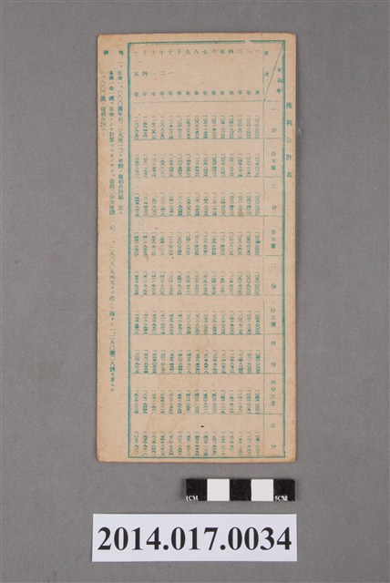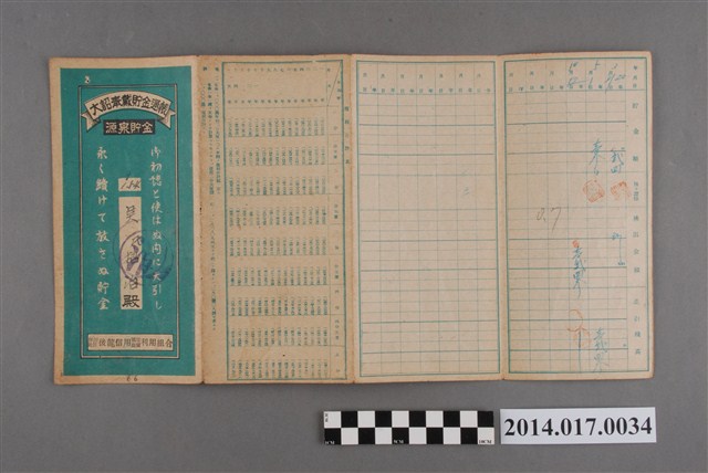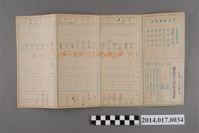 地址處印有日月產業株式會社臺灣工場字樣及後龍126番地。本物件為戰爭期間1943年~1945年期間後龍、公司寮、水尾子、二張犁、大山腳、頭湖、崎頂等地人民之銷帳儲金簿,內頁印有大詔奉戴字樣,並以婚葬儀式簡化、宴會遠慮、新謁見合せ、虛禮廢止、節酒節煙、徒步勵行、副業勉強倡導儲金,另外印有儲簿規定如:不許轉讓、改印需申請等,背頁附有複利合計表。大詔指的是1941年對美、英兩國之宣戰詔書,1942年起每個月8日定為大詔奉戴日,為日本政府為太平洋戰爭所運作的國民運動,隨著戰爭規模擴大,戰時有各項國民強迫儲蓄的舉措,以支援前線戰事,1938年日本政府為因應中日戰爭即推行有愛國儲蓄運動,本物件則為1942年後因應戰爭規模擴大後之儲蓄項目,范雅鈞指出本儲金簿為強制存款,直接由薪資扣除。