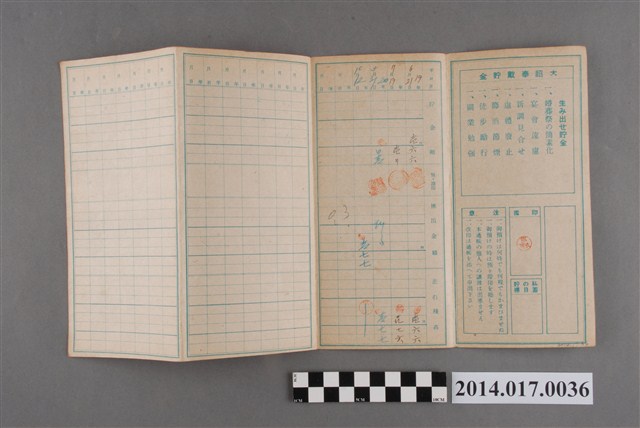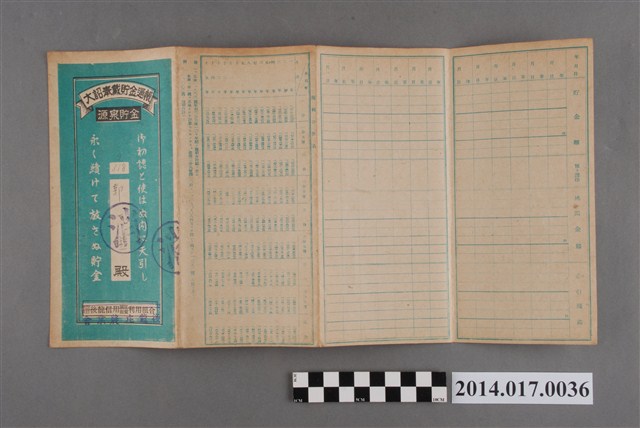 本物件為戰爭期間1943年~1945年期間後龍、公司寮、水尾子、二張犁、大山腳、頭湖、崎頂等地人民之銷帳儲金簿,內頁印有大詔奉戴字樣,並以婚葬儀式簡化、宴會遠慮、新謁見合せ、虛禮廢止、節酒節煙、徒步勵行、副業勉強倡導儲金,另外印有儲簿規定如:不許轉讓、改印需申請等,背頁附有複利合計表。大詔指的是1941年對美、英兩國之宣戰詔書,1942年起每個月8日定為大詔奉戴日,為日本政府為太平洋戰爭所運作的國民運動,隨著戰爭規模擴大,戰時有各項國民強迫儲蓄的舉措,以支援前線戰事,1938年日本政府為因應中日戰爭即推行有愛國儲蓄運動,本物件則為1942年後因應戰爭規模擴大後之儲蓄項目,范雅鈞指出本儲金簿為強制存款,直接由薪資扣除。