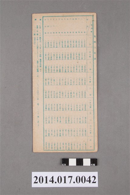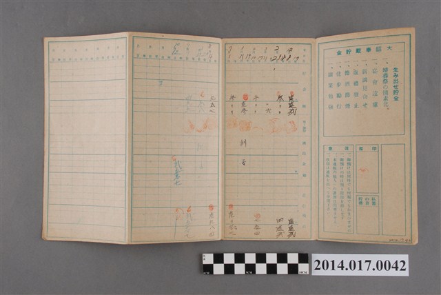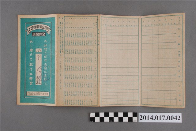 無地址。本物件為戰爭期間1943年~1945年期間後龍、公司寮、水尾子、二張犁、大山腳、頭湖、崎頂等地人民之銷帳儲金簿,內頁印有大詔奉戴字樣,並以婚葬儀式簡化、宴會遠慮、新謁見合せ、虛禮廢止、節酒節煙、徒步勵行、副業勉強倡導儲金,另外印有儲簿規定如:不許轉讓、改印需申請等,背頁附有複利合計表。大詔指的是1941年對美、英兩國之宣戰詔書,1942年起每個月8日定為大詔奉戴日,為日本政府為太平洋戰爭所運作的國民運動,隨著戰爭規模擴大,戰時有各項國民強迫儲蓄的舉措,以支援前線戰事,1938年日本政府為因應中日戰爭即推行有愛國儲蓄運動,本物件則為1942年後因應戰爭規模擴大後之儲蓄項目,范雅鈞指出本儲金簿為強制存款,直接由薪資扣除。