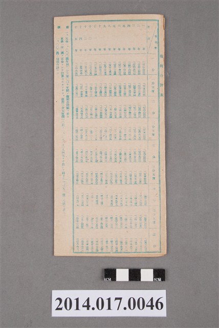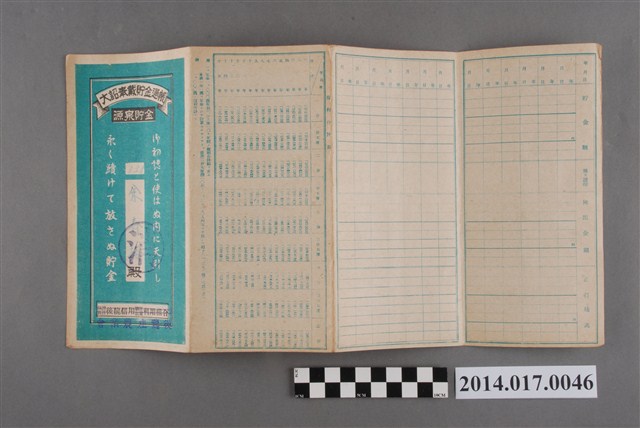 地址載為大庄371。本物件為戰爭期間1943年~1945年期間後龍、公司寮、水尾子、二張犁、大山腳、頭湖、崎頂等地人民之銷帳儲金簿,內頁印有大詔奉戴字樣,並以婚葬儀式簡化、宴會遠慮、新謁見合せ、虛禮廢止、節酒節煙、徒步勵行、副業勉強倡導儲金,另外印有儲簿規定如:不許轉讓、改印需申請等,背頁附有複利合計表。大詔指的是1941年對美、英兩國之宣戰詔書,1942年起每個月8日定為大詔奉戴日,為日本政府為太平洋戰爭所運作的國民運動,隨著戰爭規模擴大,戰時有各項國民強迫儲蓄的舉措,以支援前線戰事,1938年日本政府為因應中日戰爭即推行有愛國儲蓄運動,本物件則為1942年後因應戰爭規模擴大後之儲蓄項目,范雅鈞指出本儲金簿為強制存款,直接由薪資扣除。
