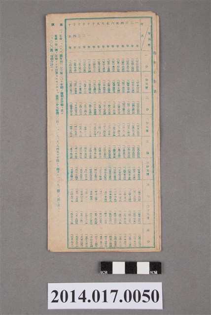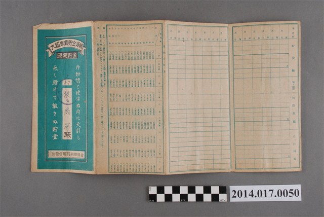 地址載為烏眉181番地。本物件為戰爭期間1943年~1945年期間後龍、公司寮、水尾子、二張犁、大山腳、頭湖、崎頂等地人民之銷帳儲金簿,內頁印有大詔奉戴字樣,並以婚葬儀式簡化、宴會遠慮、新謁見合せ、虛禮廢止、節酒節煙、徒步勵行、副業勉強倡導儲金,另外印有儲簿規定如:不許轉讓、改印需申請等,背頁附有複利合計表。大詔指的是1941年對美、英兩國之宣戰詔書,1942年起每個月8日定為大詔奉戴日,為日本政府為太平洋戰爭所運作的國民運動,隨著戰爭規模擴大,戰時有各項國民強迫儲蓄的舉措,以支援前線戰事,1938年日本政府為因應中日戰爭即推行有愛國儲蓄運動,本物件則為1942年後因應戰爭規模擴大後之儲蓄項目,范雅鈞指出本儲金簿為強制存款,直接由薪資扣除。