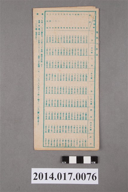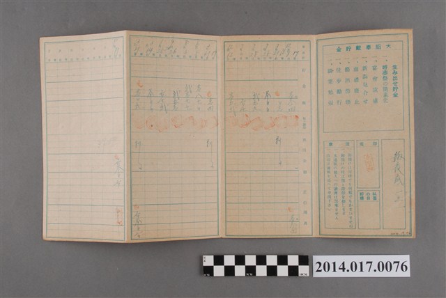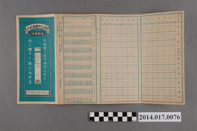 地址登載為後龍底131。本物件為戰爭期間1943年~1945年期間後龍、公司寮、水尾子、二張犁、大山腳、頭湖、崎頂等地人民之銷帳儲金簿,內頁印有大詔奉戴字樣,並以婚葬儀式簡化、宴會遠慮、新謁見合せ、虛禮廢止、節酒節煙、徒步勵行、副業勉強倡導儲金,另外印有儲簿規定如:不許轉讓、改印需申請等,背頁附有複利合計表。大詔指的是1941年對美、英兩國之宣戰詔書,1942年起每個月8日定為大詔奉戴日,為日本政府為太平洋戰爭所運作的國民運動,隨著戰爭規模擴大,戰時有各項國民強迫儲蓄的舉措,以支援前線戰事,1938年日本政府為因應中日戰爭即推行有愛國儲蓄運動,本物件則為1942年後因應戰爭規模擴大後之儲蓄項目,范雅鈞指出本儲金簿為強制存款,直接由薪資扣除。