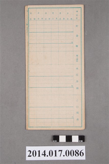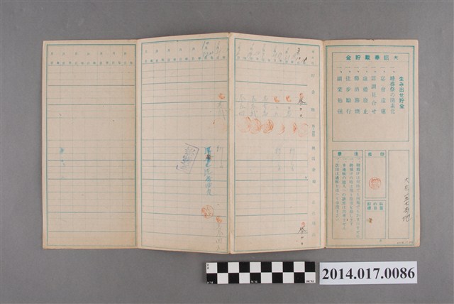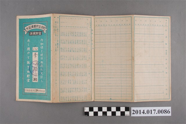 地址載為大庄157番地。本物件為戰爭期間1943年~1945年期間後龍、公司寮、水尾子、二張犁、大山腳、頭湖、崎頂等地人民之銷帳儲金簿,內頁印有大詔奉戴字樣,並以婚葬儀式簡化、宴會遠慮、新謁見合せ、虛禮廢止、節酒節煙、徒步勵行、副業勉強倡導儲金,另外印有儲簿規定如:不許轉讓、改印需申請等,背頁附有複利合計表。大詔指的是1941年對美、英兩國之宣戰詔書,1942年起每個月8日定為大詔奉戴日,為日本政府為太平洋戰爭所運作的國民運動,隨著戰爭規模擴大,戰時有各項國民強迫儲蓄的舉措,以支援前線戰事,1938年日本政府為因應中日戰爭即推行有愛國儲蓄運動,本物件則為1942年後因應戰爭規模擴大後之儲蓄項目,范雅鈞指出本儲金簿為強制存款,直接由薪資扣除。