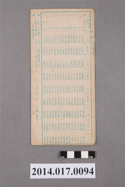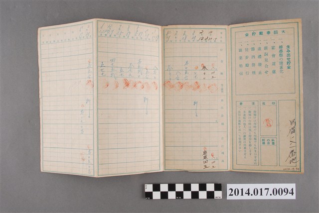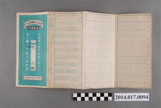 地址載為烏眉181番地。本物件為戰爭期間1943年~1945年期間後龍、公司寮、水尾子、二張犁、大山腳、頭湖、崎頂等地人民之銷帳儲金簿,內頁印有大詔奉戴字樣,並以婚葬儀式簡化、宴會遠慮、新謁見合せ、虛禮廢止、節酒節煙、徒步勵行、副業勉強倡導儲金,另外印有儲簿規定如:不許轉讓、改印需申請等,背頁附有複利合計表。大詔指的是1941年對美、英兩國之宣戰詔書,1942年起每個月8日定為大詔奉戴日,為日本政府為太平洋戰爭所運作的國民運動,隨著戰爭規模擴大,戰時有各項國民強迫儲蓄的舉措,以支援前線戰事,1938年日本政府為因應中日戰爭即推行有愛國儲蓄運動,本物件則為1942年後因應戰爭規模擴大後之儲蓄項目,范雅鈞指出本儲金簿為強制存款,直接由薪資扣除。