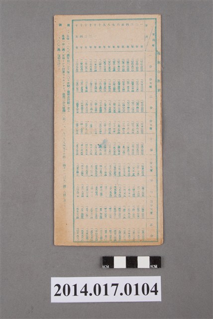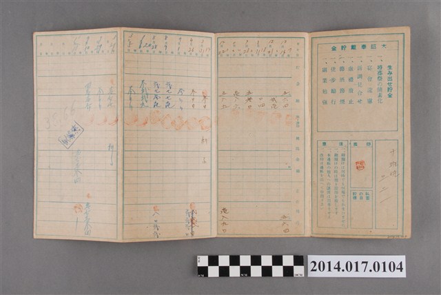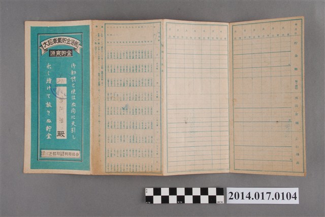 地址載為十班坑321。本物件為戰爭期間1943年~1945年期間後龍、公司寮、水尾子、二張犁、大山腳、頭湖、崎頂等地人民之銷帳儲金簿,內頁印有大詔奉戴字樣,並以婚葬儀式簡化、宴會遠慮、新謁見合せ、虛禮廢止、節酒節煙、徒步勵行、副業勉強倡導儲金,另外印有儲簿規定如:不許轉讓、改印需申請等,背頁附有複利合計表。大詔指的是1941年對美、英兩國之宣戰詔書,1942年起每個月8日定為大詔奉戴日,為日本政府為太平洋戰爭所運作的國民運動,隨著戰爭規模擴大,戰時有各項國民強迫儲蓄的舉措,以支援前線戰事,1938年日本政府為因應中日戰爭即推行有愛國儲蓄運動,本物件則為1942年後因應戰爭規模擴大後之儲蓄項目,范雅鈞指出本儲金簿為強制存款,直接由薪資扣除。