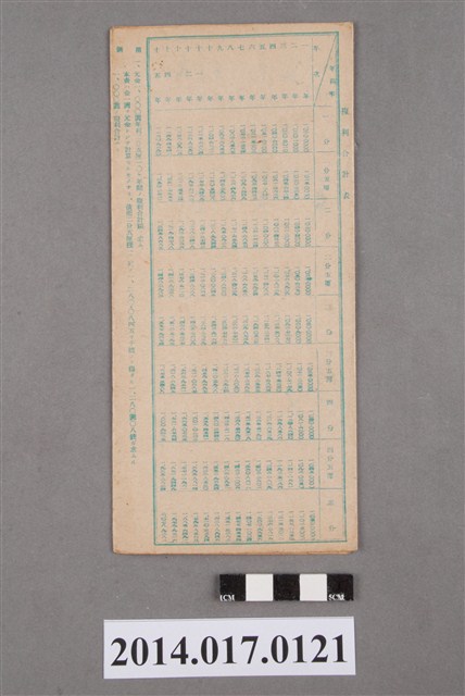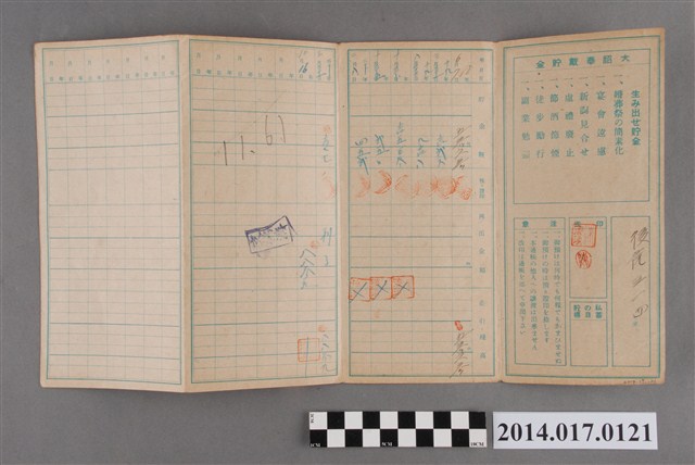 地址載為後龍314。本物件為戰爭期間1943年~1945年期間後龍、公司寮、水尾子、二張犁、大山腳、頭湖、崎頂等地人民之銷帳儲金簿,內頁印有大詔奉戴字樣,並以婚葬儀式簡化、宴會遠慮、新謁見合せ、虛禮廢止、節酒節煙、徒步勵行、副業勉強倡導儲金,另外印有儲簿規定如:不許轉讓、改印需申請等,背頁附有複利合計表。大詔指的是1941年對美、英兩國之宣戰詔書,1942年起每個月8日定為大詔奉戴日,為日本政府為太平洋戰爭所運作的國民運動,隨著戰爭規模擴大,戰時有各項國民強迫儲蓄的舉措,以支援前線戰事,1938年日本政府為因應中日戰爭即推行有愛國儲蓄運動,本物件則為1942年後因應戰爭規模擴大後之儲蓄項目,范雅鈞指出本儲金簿為強制存款,直接由薪資扣除。