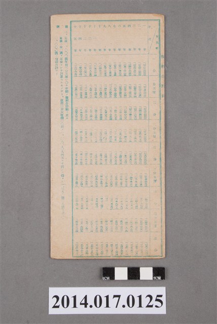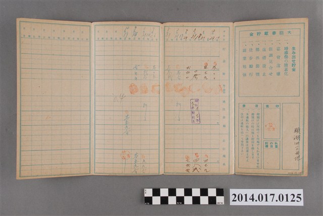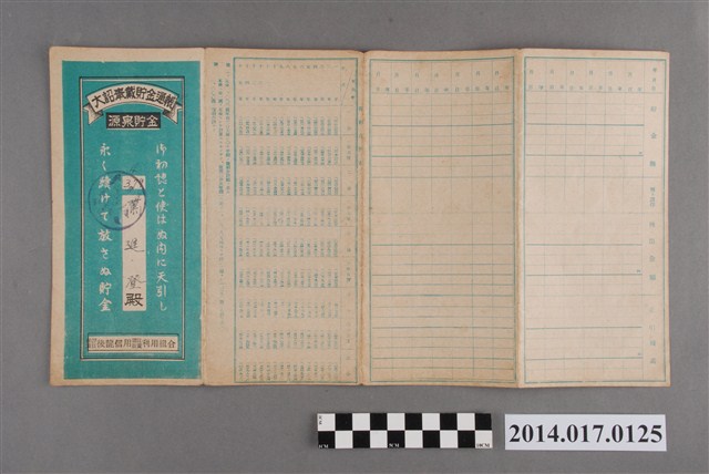 地址載為頭湖413番地。本物件為戰爭期間1943年~1945年期間後龍、公司寮、水尾子、二張犁、大山腳、頭湖、崎頂等地人民之銷帳儲金簿,內頁印有大詔奉戴字樣,並以婚葬儀式簡化、宴會遠慮、新謁見合せ、虛禮廢止、節酒節煙、徒步勵行、副業勉強倡導儲金,另外印有儲簿規定如:不許轉讓、改印需申請等,背頁附有複利合計表。大詔指的是1941年對美、英兩國之宣戰詔書,1942年起每個月8日定為大詔奉戴日,為日本政府為太平洋戰爭所運作的國民運動,隨著戰爭規模擴大,戰時有各項國民強迫儲蓄的舉措,以支援前線戰事,1938年日本政府為因應中日戰爭即推行有愛國儲蓄運動,本物件則為1942年後因應戰爭規模擴大後之儲蓄項目,范雅鈞指出本儲金簿為強制存款,直接由薪資扣除。