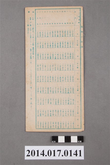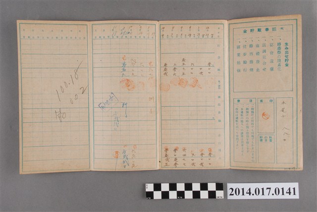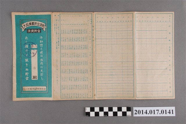 地址登載為水尾子880。本物件為戰爭期間1943年~1945年期間後龍、公司寮、水尾子、二張犁、大山腳、頭湖、崎頂等地人民之銷帳儲金簿,內頁印有大詔奉戴字樣,並以婚葬儀式簡化、宴會遠慮、新謁見合せ、虛禮廢止、節酒節煙、徒步勵行、副業勉強倡導儲金,另外印有儲簿規定如:不許轉讓、改印需申請等,背頁附有複利合計表。大詔指的是1941年對美、英兩國之宣戰詔書,1942年起每個月8日定為大詔奉戴日,為日本政府為太平洋戰爭所運作的國民運動,隨著戰爭規模擴大,戰時有各項國民強迫儲蓄的舉措,以支援前線戰事,1938年日本政府為因應中日戰爭即推行有愛國儲蓄運動,本物件則為1942年後因應戰爭規模擴大後之儲蓄項目,范雅鈞指出本儲金簿為強制存款,直接由薪資扣除。