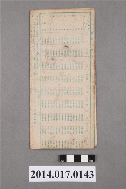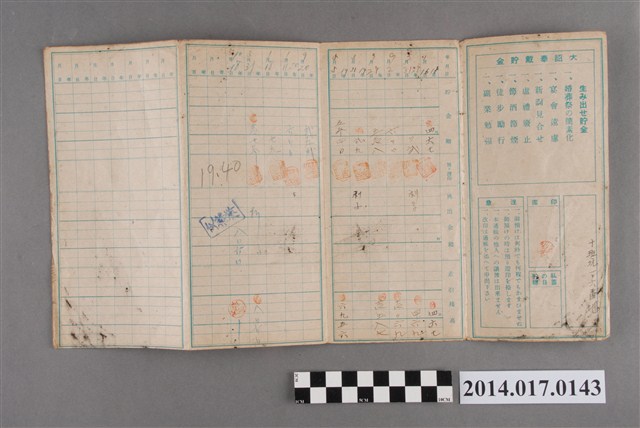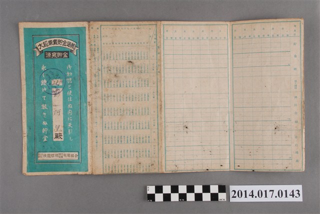 地址登載為十班坑106番地。本物件為戰爭期間1943年~1945年期間後龍、公司寮、水尾子、二張犁、大山腳、頭湖、崎頂等地人民之銷帳儲金簿,內頁印有大詔奉戴字樣,並以婚葬儀式簡化、宴會遠慮、新謁見合せ、虛禮廢止、節酒節煙、徒步勵行、副業勉強倡導儲金,另外印有儲簿規定如:不許轉讓、改印需申請等,背頁附有複利合計表。大詔指的是1941年對美、英兩國之宣戰詔書,1942年起每個月8日定為大詔奉戴日,為日本政府為太平洋戰爭所運作的國民運動,隨著戰爭規模擴大,戰時有各項國民強迫儲蓄的舉措,以支援前線戰事,1938年日本政府為因應中日戰爭即推行有愛國儲蓄運動,本物件則為1942年後因應戰爭規模擴大後之儲蓄項目,范雅鈞指出本儲金簿為強制存款,直接由薪資扣除。