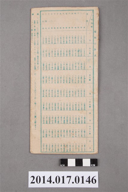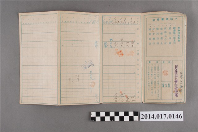 地址登載為後龍180番地。本物件為戰爭期間1943年~1945年期間後龍、公司寮、水尾子、二張犁、大山腳、頭湖、崎頂等地人民之銷帳儲金簿,內頁印有大詔奉戴字樣,並以婚葬儀式簡化、宴會遠慮、新謁見合せ、虛禮廢止、節酒節煙、徒步勵行、副業勉強倡導儲金,另外印有儲簿規定如:不許轉讓、改印需申請等,背頁附有複利合計表。大詔指的是1941年對美、英兩國之宣戰詔書,1942年起每個月8日定為大詔奉戴日,為日本政府為太平洋戰爭所運作的國民運動,隨著戰爭規模擴大,戰時有各項國民強迫儲蓄的舉措,以支援前線戰事,1938年日本政府為因應中日戰爭即推行有愛國儲蓄運動,本物件則為1942年後因應戰爭規模擴大後之儲蓄項目,范雅鈞指出本儲金簿為強制存款,直接由薪資扣除。