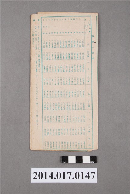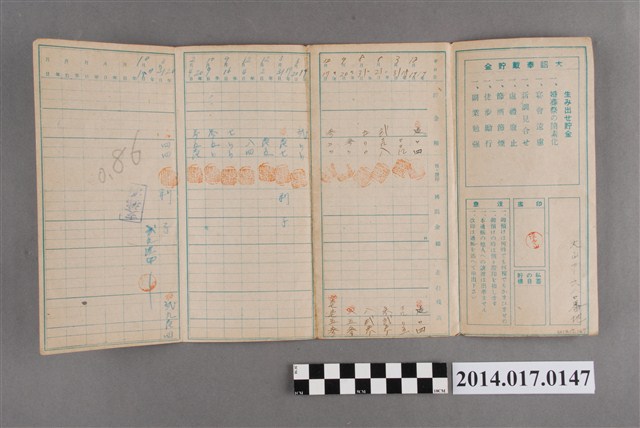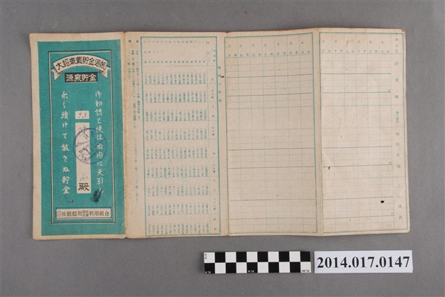 地址登載為大山ア680番地。本物件為戰爭期間1943年~1945年期間後龍、公司寮、水尾子、二張犁、大山腳、頭湖、崎頂等地人民之銷帳儲金簿,內頁印有大詔奉戴字樣,並以婚葬儀式簡化、宴會遠慮、新謁見合せ、虛禮廢止、節酒節煙、徒步勵行、副業勉強倡導儲金,另外印有儲簿規定如:不許轉讓、改印需申請等,背頁附有複利合計表。大詔指的是1941年對美、英兩國之宣戰詔書,1942年起每個月8日定為大詔奉戴日,為日本政府為太平洋戰爭所運作的國民運動,隨著戰爭規模擴大,戰時有各項國民強迫儲蓄的舉措,以支援前線戰事,1938年日本政府為因應中日戰爭即推行有愛國儲蓄運動,本物件則為1942年後因應戰爭規模擴大後之儲蓄項目,范雅鈞指出本儲金簿為強制存款,直接由薪資扣除。