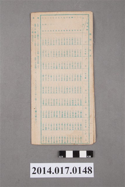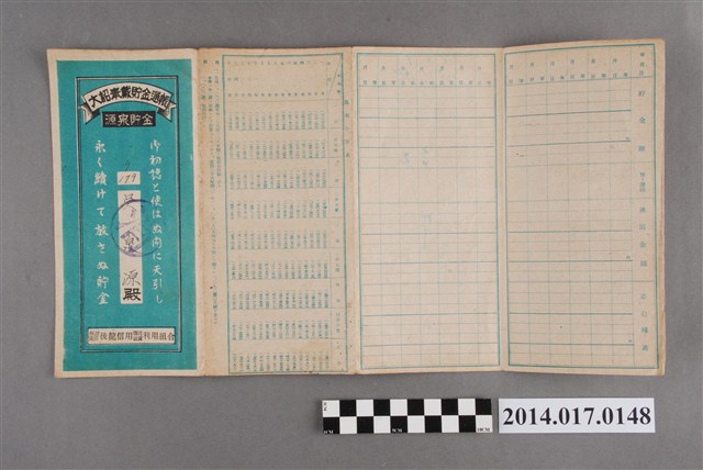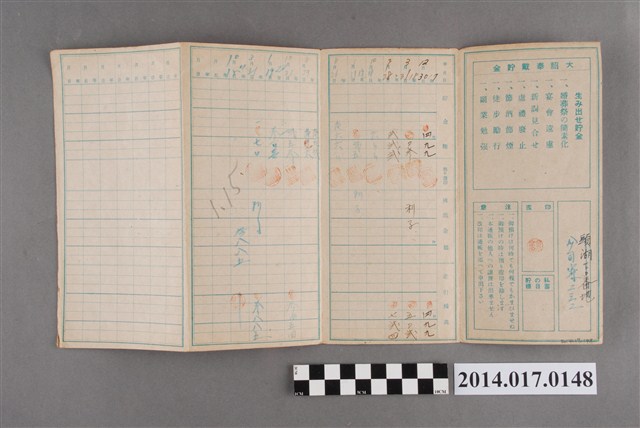 地址登載為公司寮232。本物件為戰爭期間1943年~1945年期間後龍、公司寮、水尾子、二張犁、大山腳、頭湖、崎頂等地人民之銷帳儲金簿,內頁印有大詔奉戴字樣,並以婚葬儀式簡化、宴會遠慮、新謁見合せ、虛禮廢止、節酒節煙、徒步勵行、副業勉強倡導儲金,另外印有儲簿規定如:不許轉讓、改印需申請等,背頁附有複利合計表。大詔指的是1941年對美、英兩國之宣戰詔書,1942年起每個月8日定為大詔奉戴日,為日本政府為太平洋戰爭所運作的國民運動,隨著戰爭規模擴大,戰時有各項國民強迫儲蓄的舉措,以支援前線戰事,1938年日本政府為因應中日戰爭即推行有愛國儲蓄運動,本物件則為1942年後因應戰爭規模擴大後之儲蓄項目,范雅鈞指出本儲金簿為強制存款,直接由薪資扣除。