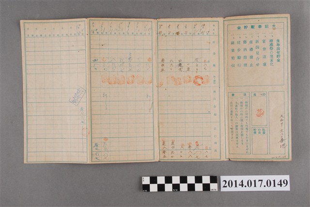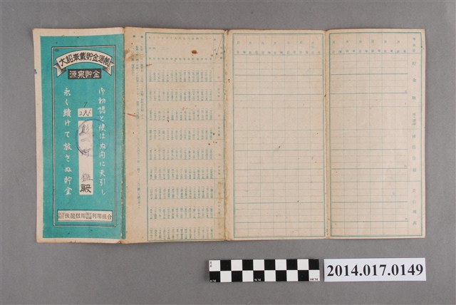 地址登載為大山ア680番地。本物件為戰爭期間1943年~1945年期間後龍、公司寮、水尾子、二張犁、大山腳、頭湖、崎頂等地人民之銷帳儲金簿,內頁印有大詔奉戴字樣,並以婚葬儀式簡化、宴會遠慮、新謁見合せ、虛禮廢止、節酒節煙、徒步勵行、副業勉強倡導儲金,另外印有儲簿規定如:不許轉讓、改印需申請等,背頁附有複利合計表。大詔指的是1941年對美、英兩國之宣戰詔書,1942年起每個月8日定為大詔奉戴日,為日本政府為太平洋戰爭所運作的國民運動,隨著戰爭規模擴大,戰時有各項國民強迫儲蓄的舉措,以支援前線戰事,1938年日本政府為因應中日戰爭即推行有愛國儲蓄運動,本物件則為1942年後因應戰爭規模擴大後之儲蓄項目,范雅鈞指出本儲金簿為強制存款,直接由薪資扣除。