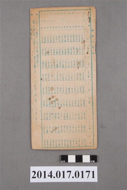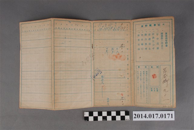 地址載為苦苓腳901。本物件為戰爭期間1943年~1945年期間後龍、公司寮、水尾子、二張犁、大山腳、頭湖、崎頂等地人民之銷帳儲金簿,內頁印有大詔奉戴字樣,並以婚葬儀式簡化、宴會遠慮、新謁見合せ、虛禮廢止、節酒節煙、徒步勵行、副業勉強倡導儲金,另外印有儲簿規定如:不許轉讓、改印需申請等,背頁附有複利合計表。大詔指的是1941年對美、英兩國之宣戰詔書,1942年起每個月8日定為大詔奉戴日,為日本政府為太平洋戰爭所運作的國民運動,隨著戰爭規模擴大,戰時有各項國民強迫儲蓄的舉措,以支援前線戰事,1938年日本政府為因應中日戰爭即推行有愛國儲蓄運動,本物件則為1942年後因應戰爭規模擴大後之儲蓄項目,范雅鈞指出本儲金簿為強制存款,直接由薪資扣除。