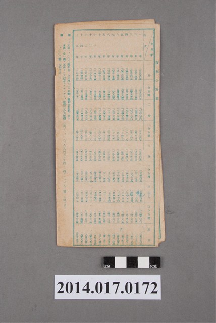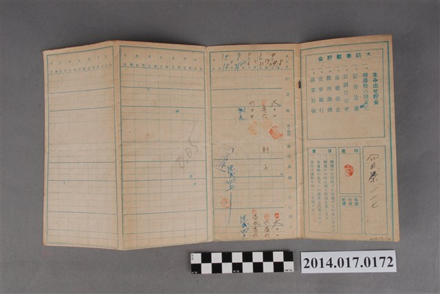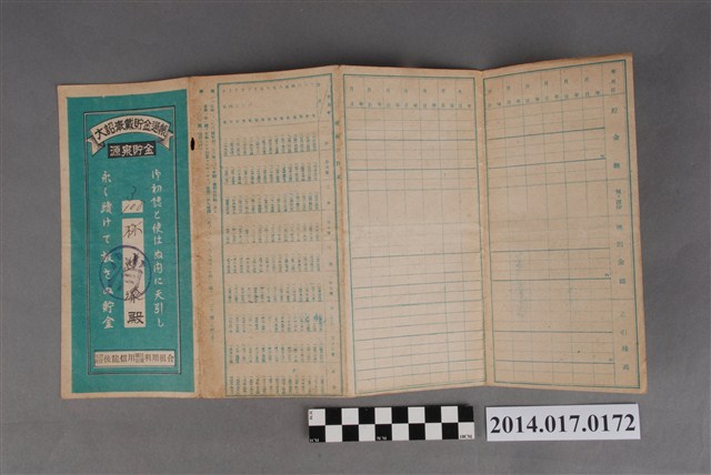 地址載有公司寮117。本物件為戰爭期間1943年~1945年期間後龍、公司寮、水尾子、二張犁、大山腳、頭湖、崎頂等地人民之銷帳儲金簿,內頁印有大詔奉戴字樣,並以婚葬儀式簡化、宴會遠慮、新謁見合せ、虛禮廢止、節酒節煙、徒步勵行、副業勉強倡導儲金,另外印有儲簿規定如:不許轉讓、改印需申請等,背頁附有複利合計表。大詔指的是1941年對美、英兩國之宣戰詔書,1942年起每個月8日定為大詔奉戴日,為日本政府為太平洋戰爭所運作的國民運動,隨著戰爭規模擴大,戰時有各項國民強迫儲蓄的舉措,以支援前線戰事,1938年日本政府為因應中日戰爭即推行有愛國儲蓄運動,本物件則為1942年後因應戰爭規模擴大後之儲蓄項目,范雅鈞指出本儲金簿為強制存款,直接由薪資扣除。