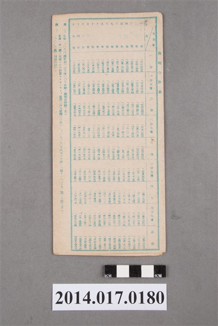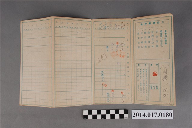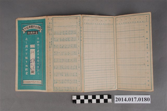 地址登載為公司寮165。本物件為戰爭期間1943年~1945年期間後龍、公司寮、水尾子、二張犁、大山腳、頭湖、崎頂等地人民之銷帳儲金簿,內頁印有大詔奉戴字樣,並以婚葬儀式簡化、宴會遠慮、新謁見合せ、虛禮廢止、節酒節煙、徒步勵行、副業勉強倡導儲金,另外印有儲簿規定如:不許轉讓、改印需申請等,背頁附有複利合計表。大詔指的是1941年對美、英兩國之宣戰詔書,1942年起每個月8日定為大詔奉戴日,為日本政府為太平洋戰爭所運作的國民運動,隨著戰爭規模擴大,戰時有各項國民強迫儲蓄的舉措,以支援前線戰事,1938年日本政府為因應中日戰爭即推行有愛國儲蓄運動,本物件則為1942年後因應戰爭規模擴大後之儲蓄項目,范雅鈞指出本儲金簿為強制存款,直接由薪資扣除。