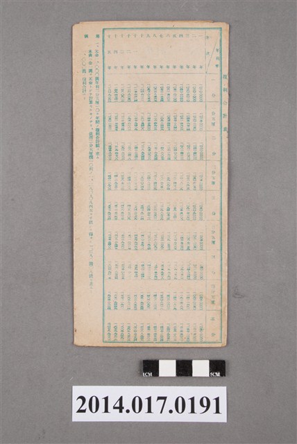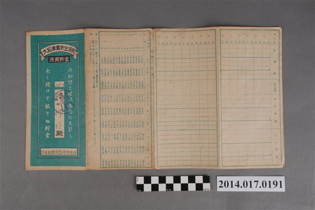 地址登載為公司寮193。本物件為戰爭期間1943年~1945年期間後龍、公司寮、水尾子、二張犁、大山腳、頭湖、崎頂等地人民之銷帳儲金簿,內頁印有大詔奉戴字樣,並以婚葬儀式簡化、宴會遠慮、新謁見合せ、虛禮廢止、節酒節煙、徒步勵行、副業勉強倡導儲金,另外印有儲簿規定如:不許轉讓、改印需申請等,背頁附有複利合計表。大詔指的是1941年對美、英兩國之宣戰詔書,1942年起每個月8日定為大詔奉戴日,為日本政府為太平洋戰爭所運作的國民運動,隨著戰爭規模擴大,戰時有各項國民強迫儲蓄的舉措,以支援前線戰事,1938年日本政府為因應中日戰爭即推行有愛國儲蓄運動,本物件則為1942年後因應戰爭規模擴大後之儲蓄項目,范雅鈞指出本儲金簿為強制存款,直接由薪資扣除。