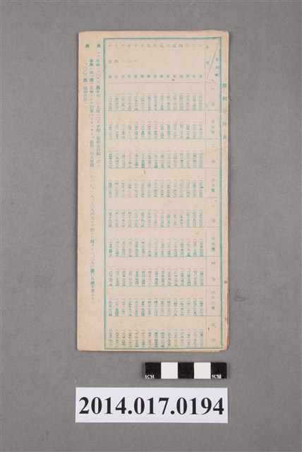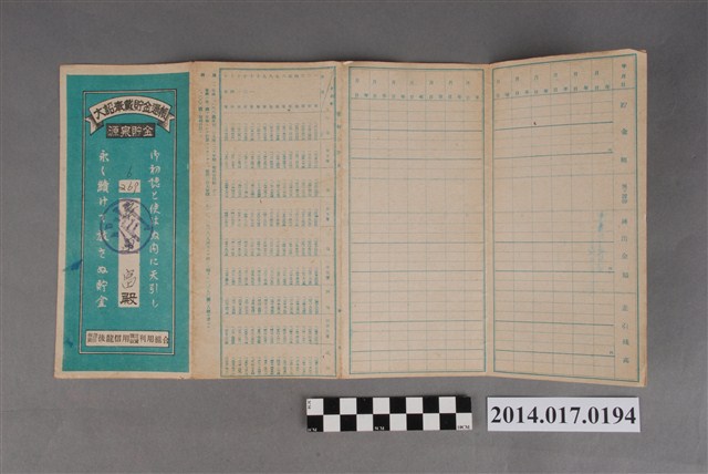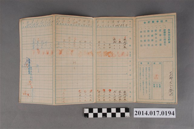 地址登載為大山腳680番地。本物件為戰爭期間1943年~1945年期間後龍、公司寮、水尾子、二張犁、大山腳、頭湖、崎頂等地人民之銷帳儲金簿,內頁印有大詔奉戴字樣,並以婚葬儀式簡化、宴會遠慮、新謁見合せ、虛禮廢止、節酒節煙、徒步勵行、副業勉強倡導儲金,另外印有儲簿規定如:不許轉讓、改印需申請等,背頁附有複利合計表。大詔指的是1941年對美、英兩國之宣戰詔書,1942年起每個月8日定為大詔奉戴日,為日本政府為太平洋戰爭所運作的國民運動,隨著戰爭規模擴大,戰時有各項國民強迫儲蓄的舉措,以支援前線戰事,1938年日本政府為因應中日戰爭即推行有愛國儲蓄運動,本物件則為1942年後因應戰爭規模擴大後之儲蓄項目,范雅鈞指出本儲金簿為強制存款,直接由薪資扣除。