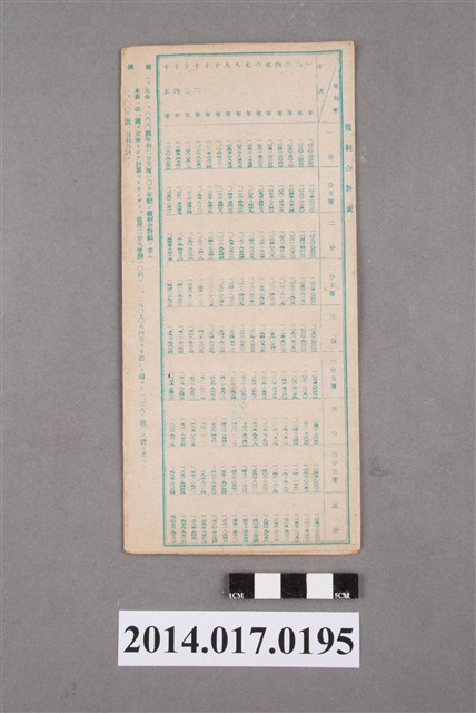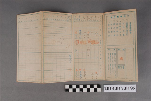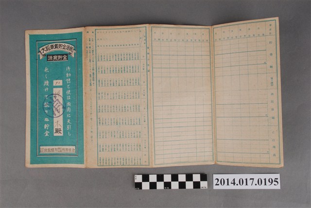 本物件為戰爭期間1943年~1945年期間後龍、公司寮、水尾子、二張犁、大山腳、頭湖、崎頂等地人民之銷帳儲金簿,內頁印有大詔奉戴字樣,並以婚葬儀式簡化、宴會遠慮、新謁見合せ、虛禮廢止、節酒節煙、徒步勵行、副業勉強倡導儲金,另外印有儲簿規定如:不許轉讓、改印需申請等,背頁附有複利合計表。大詔指的是1941年對美、英兩國之宣戰詔書,1942年起每個月8日定為大詔奉戴日,為日本政府為太平洋戰爭所運作的國民運動,隨著戰爭規模擴大,戰時有各項國民強迫儲蓄的舉措,以支援前線戰事,1938年日本政府為因應中日戰爭即推行有愛國儲蓄運動,本物件則為1942年後因應戰爭規模擴大後之儲蓄項目,范雅鈞指出本儲金簿為強制存款,直接由薪資扣除。