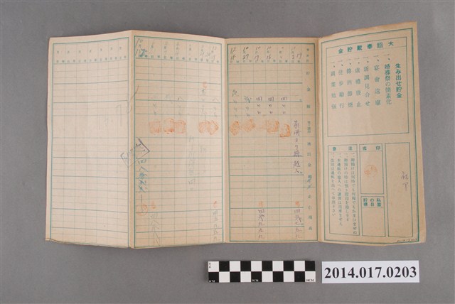 本物件為戰爭期間1943年~1945年期間後龍、公司寮、水尾子、二張犁、大山腳、頭湖、崎頂等地人民之銷帳儲金簿,內頁印有大詔奉戴字樣,並以婚葬儀式簡化、宴會遠慮、新謁見合せ、虛禮廢止、節酒節煙、徒步勵行、副業勉強倡導儲金,另外印有儲簿規定如:不許轉讓、改印需申請等,背頁附有複利合計表。大詔指的是1941年對美、英兩國之宣戰詔書,1942年起每個月8日定為大詔奉戴日,為日本政府為太平洋戰爭所運作的國民運動,隨著戰爭規模擴大,戰時有各項國民強迫儲蓄的舉措,以支援前線戰事,1938年日本政府為因應中日戰爭即推行有愛國儲蓄運動,本物件則為1942年後因應戰爭規模擴大後之儲蓄項目,范雅鈞指出本儲金簿為強制存款,直接由薪資扣除。