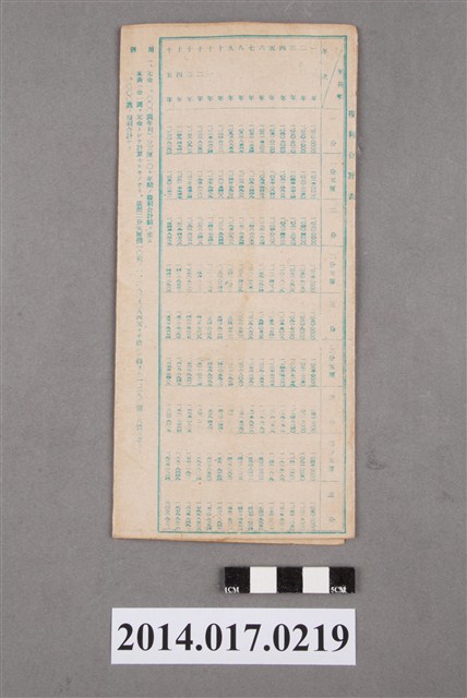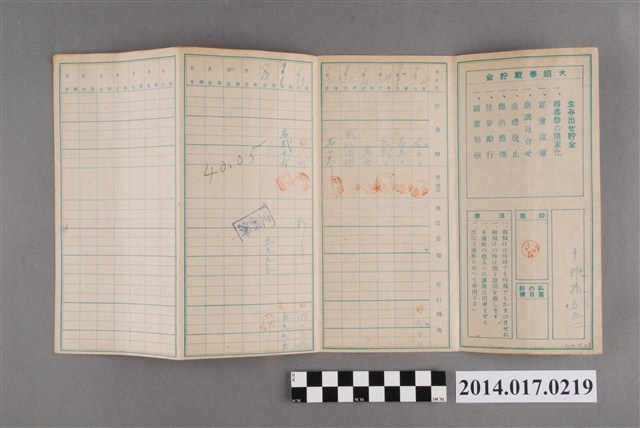地址載為十班坑552。本物件為戰爭期間1943年~1945年期間後龍、公司寮、水尾子、二張犁、大山腳、頭湖、崎頂等地人民之銷帳儲金簿,內頁印有大詔奉戴字樣,並以婚葬儀式簡化、宴會遠慮、新謁見合せ、虛禮廢止、節酒節煙、徒步勵行、副業勉強倡導儲金,另外印有儲簿規定如:不許轉讓、改印需申請等,背頁附有複利合計表。大詔指的是1941年對美、英兩國之宣戰詔書,1942年起每個月8日定為大詔奉戴日,為日本政府為太平洋戰爭所運作的國民運動,隨著戰爭規模擴大,戰時有各項國民強迫儲蓄的舉措,以支援前線戰事,1938年日本政府為因應中日戰爭即推行有愛國儲蓄運動,本物件則為1942年後因應戰爭規模擴大後之儲蓄項目,范雅鈞指出本儲金簿為強制存款,直接由薪資扣除。
